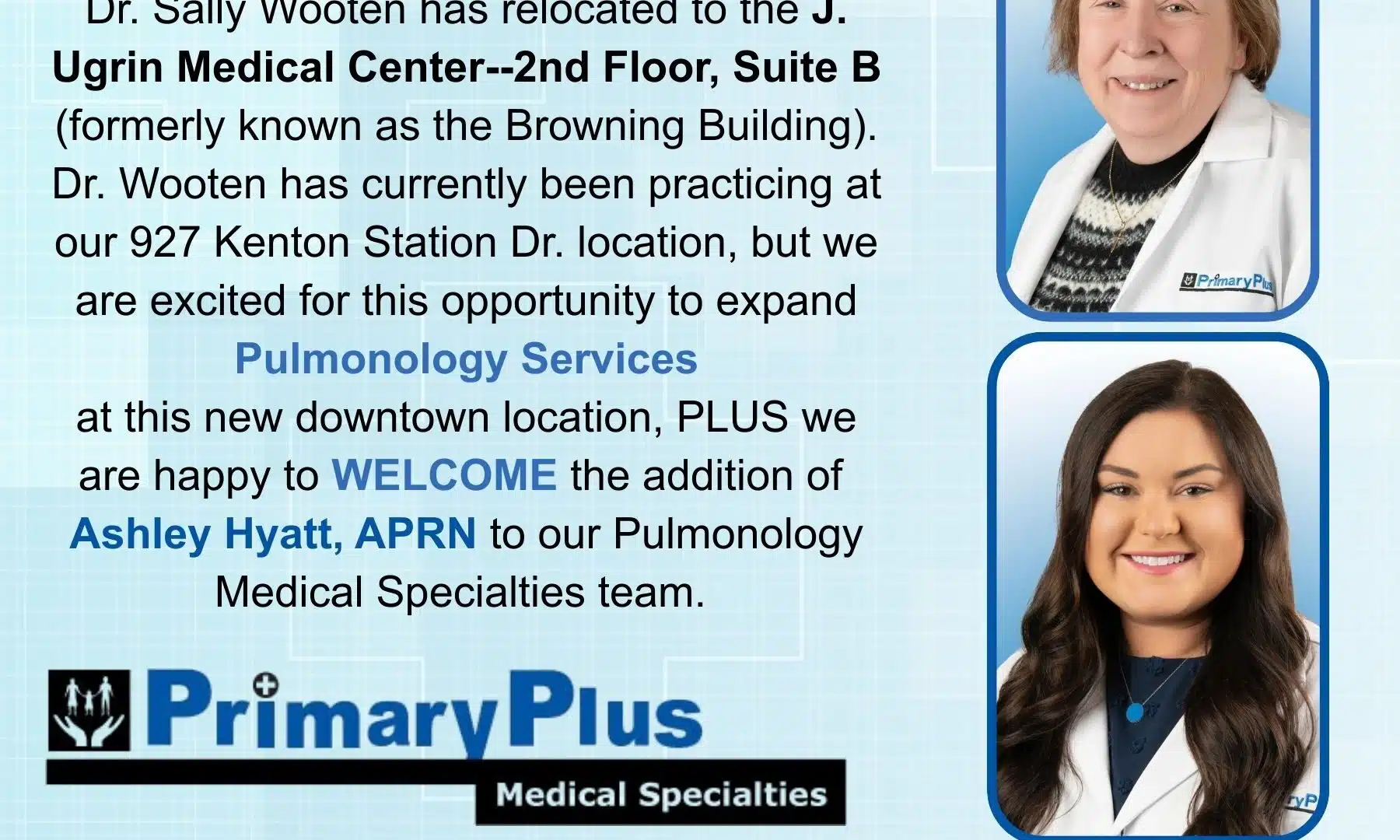 Service Location Update: On Monday, October 6th Dr. Sally Wooten will relocate to the J. Ugrin Medical Center–2nd Floor, Suite B (formerly known as the Browning Building). Dr. Wooten has currently been practicing at our 927 Kenton Station Dr. location, but we are excited for this opportunity to expand Pulmonology Services at this new downtown location.